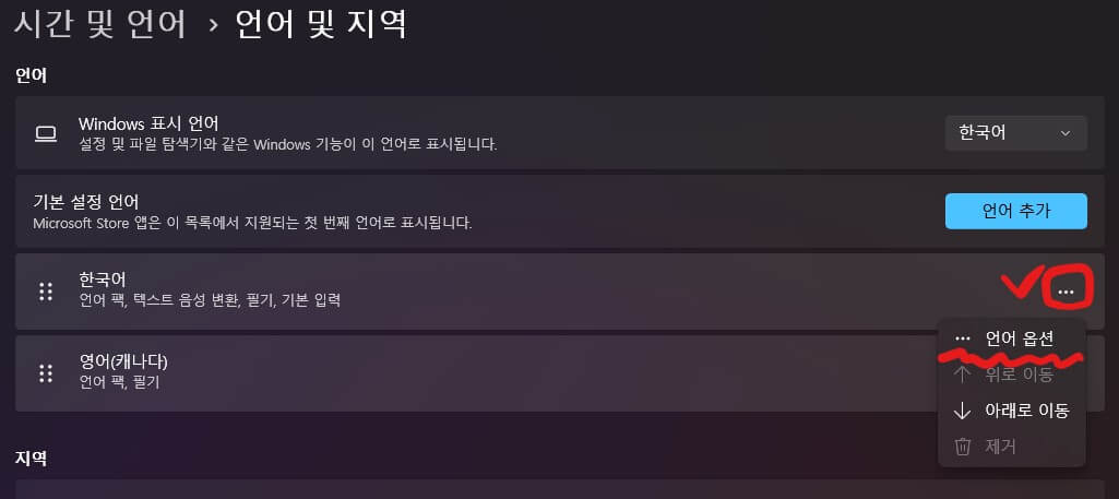 언어항목의 '한국어'에서 맨 오른쪽 점 세개를 누르면 첫 번째에 '언어 옵션'이 나타납니다. 이걸 선택하여 들어가세요.