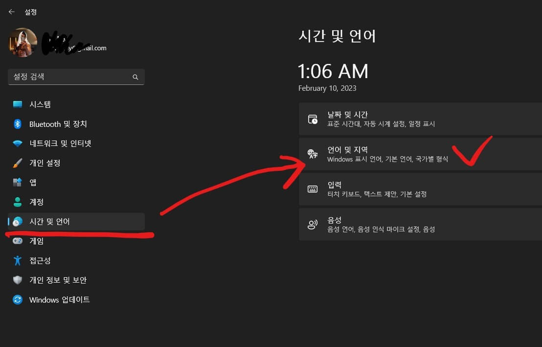 왼쪽에 일렬로 나열된 항목 중 '시간 및 언어'를 선택하고 곧이어 '언어 및 지역'을 들어갑니다.